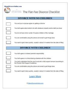 You can use this checklist to see whether your divorce qualifies as an uncontested divorce. Uncontested divorces afford you the best opportunity to get a divorce for a flat fee, not hourly fees. A flat-fee divorce is the most affordable divorce other than doing your divorce yourself. If your divorce is one with litigation, fees are usually per hour, so a flat fee is not applicable.